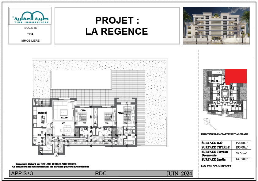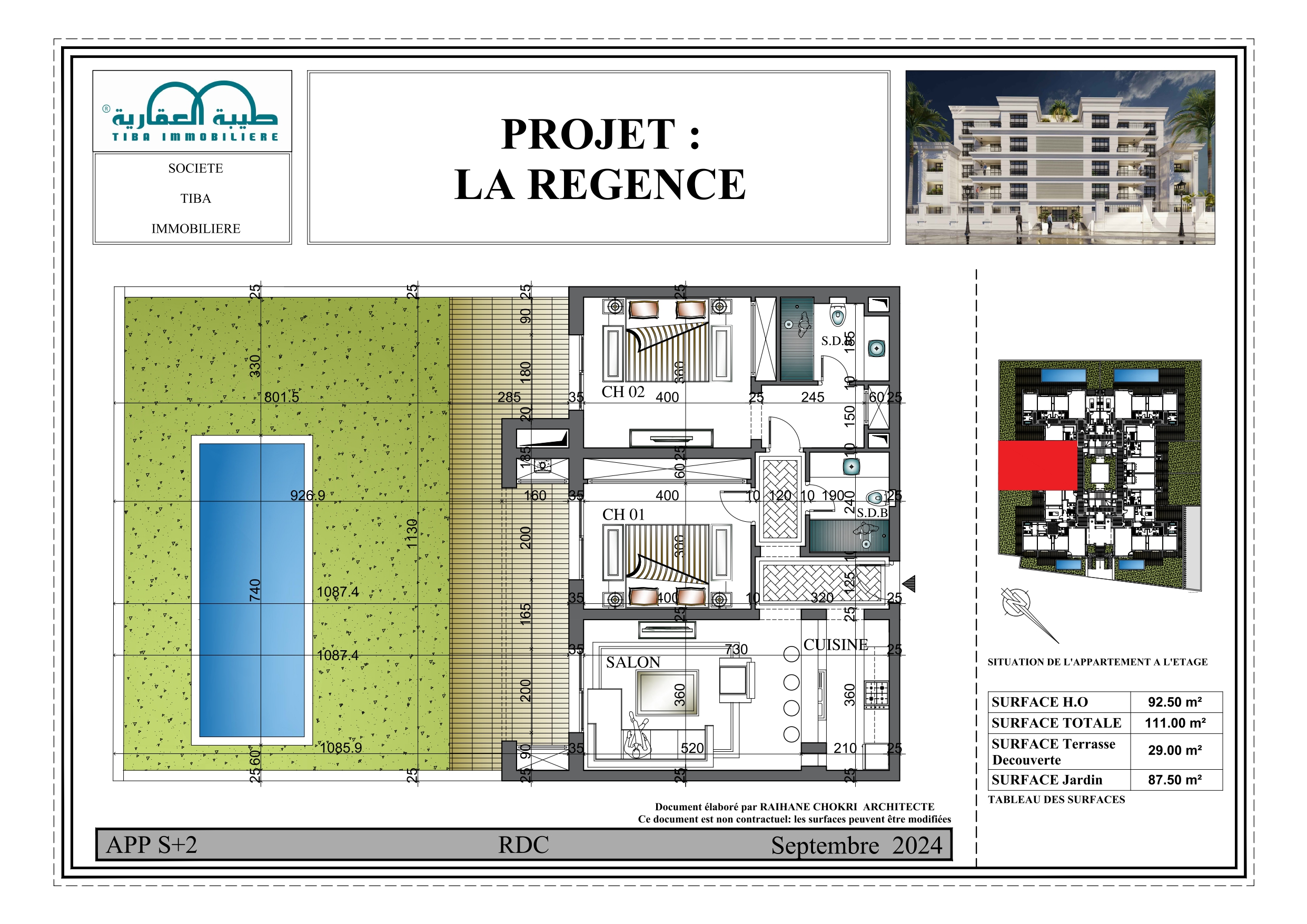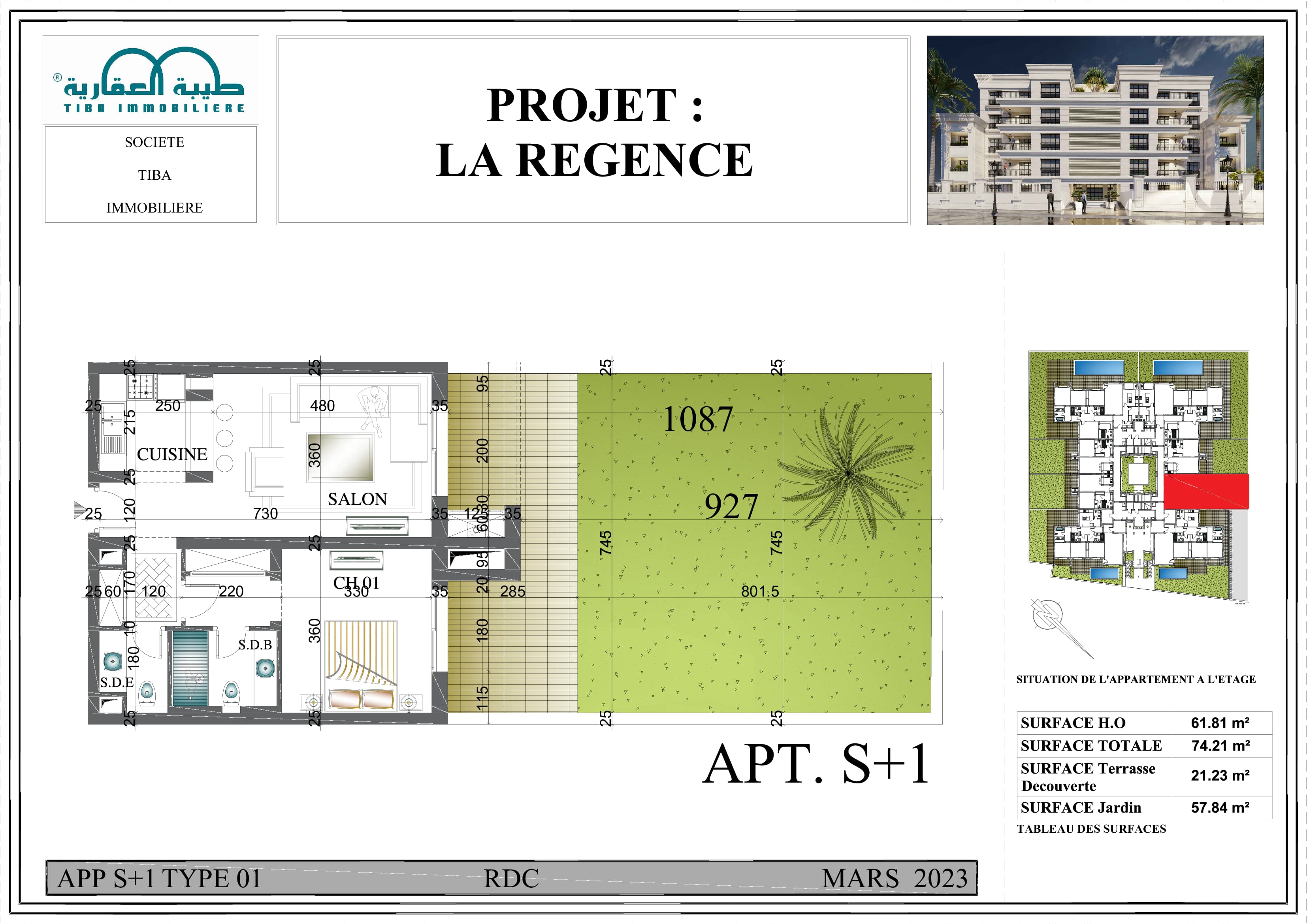 La régence : Élevez votre quotidien, vivez l'exception ! La Régence incarne le luxe et l'élégance dans un cadre d'exception. Située au cœur de Menzah 9, notre résidence vous offre des appartements spacieux et lumineux, où design contemporain et inspirations coloniales se rencontrent harmonieusement. Bienvenue chez vous, bienvenue dans l'avenir de la résidence de luxe moderne. L'accès est direct et rapide via la nouvelle route X4 qui mène au centre ville en quelques minutes. La résidence est un immeuble strictement résidentiel en R+4 qui comprend 46 appartements: S+1,S+2,S+3 et S+4 de très haut standing.