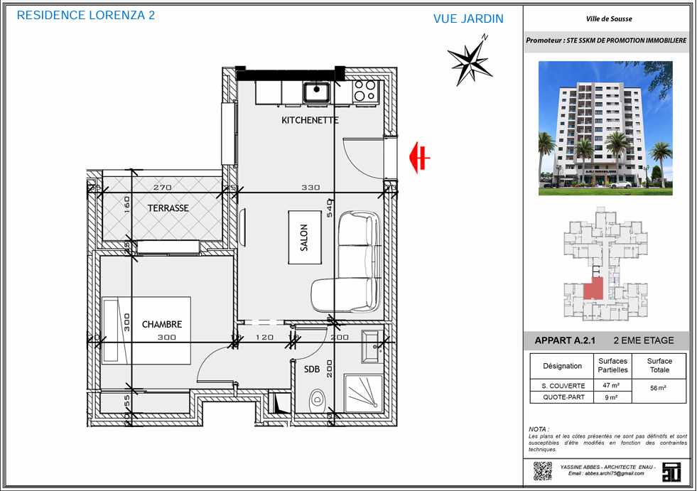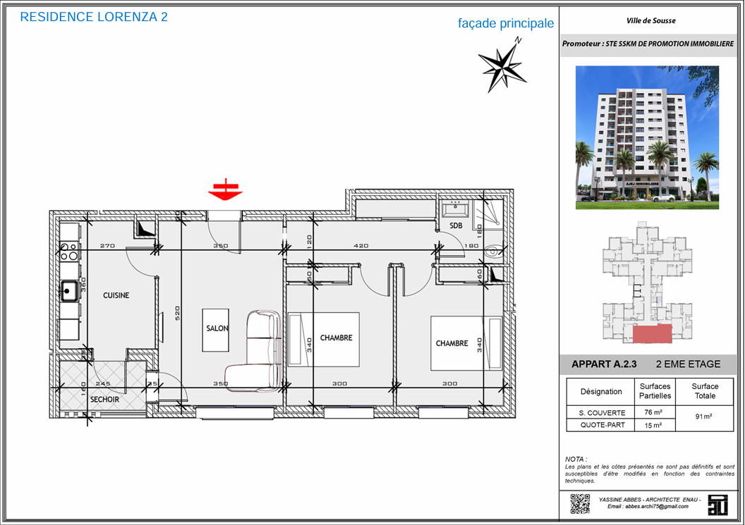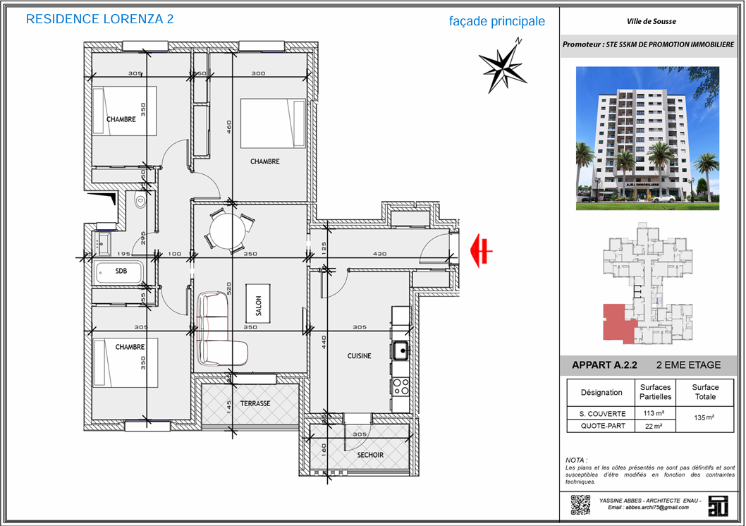 Lorenza 2, le nouveau projet signé Ajej Immobilier Au cœur de Sahloul 4, l’un des quartiers les plus prisés de la ville, Lorenza 2 s’impose comme une nouvelle référence en matière de confort résidentiel. Signée Ajej Immobilier, cette résidence haut standing allie avec élégance des matériaux nobles, une conception moderne et fonctionnelle, répondant aux attentes des familles exigeantes et des investisseurs avisés. ● Un cadre de vie complet et équilibré Lorenza 2 vous offre bien plus qu’un appartement : 1. Une salle de sport commune équipée pour prendre soin de votre santé au quotidien 2. Un espace enfant équipé, parfait pour le jeu et l’épanouissement des plus petits 3. Une magnifique terrasse avec jardin d’environ 350 m², véritable bulle de verdure pour se détendre en toute tranquillité ● Des appartements conçus pour votre confort Chaque détail a été soigneusement pensé pour vous garantir un confort optimal : 1. Cuisine moderne équipée avec hotte, plaque de cuisson et four 2. Climatiseur dans chaque chambre, pour un bien-être en toute saison 3. Isolation phonique et thermique performante, pour une atmosphère calme et agréable 4. Parking sécurisé au sous-sol pour plus de praticité au quotidien 5. Boiserie noble dans les finitions intérieures, ajoutant une touche d’élégance et de raffinement à votre espace de vie ● Un emplacement stratégique à Sahloul 4 Idéalement située, la résidence bénéficie d’un accès rapide aux commodités, aux établissements scolaires, de santé et aux axes principaux. Elle est située en face du café Yucca, un repère connu et apprécié, et près de toute commodité, ce qui rend votre quotidien encore plus agréable. Un quartier en plein développement, parfait pour y vivre ou y investir.